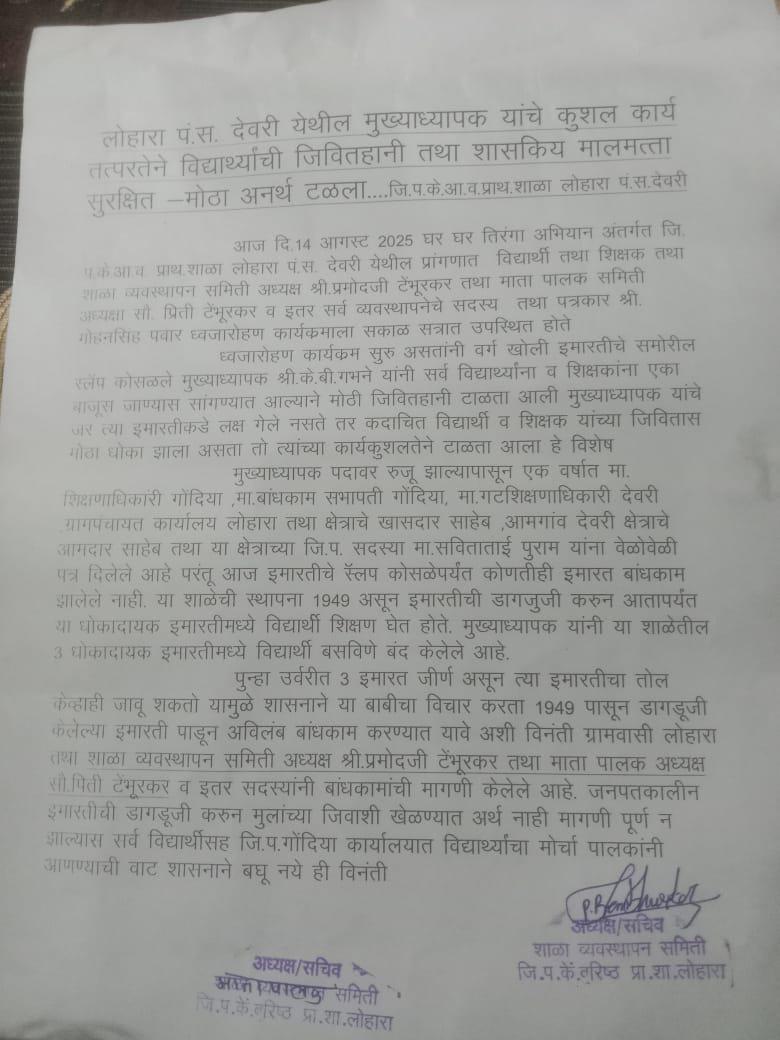आझादी का अमृत महोत्सव सुरू असतांना देशाचा भवितव्य असुरक्षित असल्याचे देवरी तालुक्यातील जिप शाळा लोहारा येथे सिद्ध झाले आहे. घर घर तिरंगा अभियान अंतर्गत जि.प केंद्र प्राथमिक शाळा लोहारा पंस देवरी येथील प्रांगणात विद्यार्थी, शिक्षक तथा शाळा व्यवस्थापन समिती अध्यक्ष प्रमोद टेंभूरकर, माता पालक समिती अध्यक्षा प्रिती टेंभूरकर इतर सर्व व्यवस्थापनेचे सदस्य तसेच मोहनसिंग पवार ध्वजारोहण कार्यक्रमाला सकाळ सत्रात उपस्थित होते. या शाळेचे मुख्याध्यापक पदावर रुजू झाल्यापासून एक वर्षात शिक्षणाधिकारी गोंदिया, बांधकाम सभापती गोंदिया, गटशिक्षणाधिकारी देवरी , ग्रामपंचायत कार्यालय लोहारा क्षेत्राचे खासदार, आमगांव देवरी क्षेत्राचे आमदार या क्षेत्राच्या जि.प. सदस्य यांना वेळोवेळी पत्र दिलेले आहे. परंतू इमारतीचे स्लैब कोसळेपर्यंत कोणतीही इमारत बांधकाम झालेले नाही. यावरून स्थानिक लोकप्रतिनिधी, राजकीय पदाधिकारी शालेय विद्यार्थ्यांसाठी किती सक्रिय आहेत.