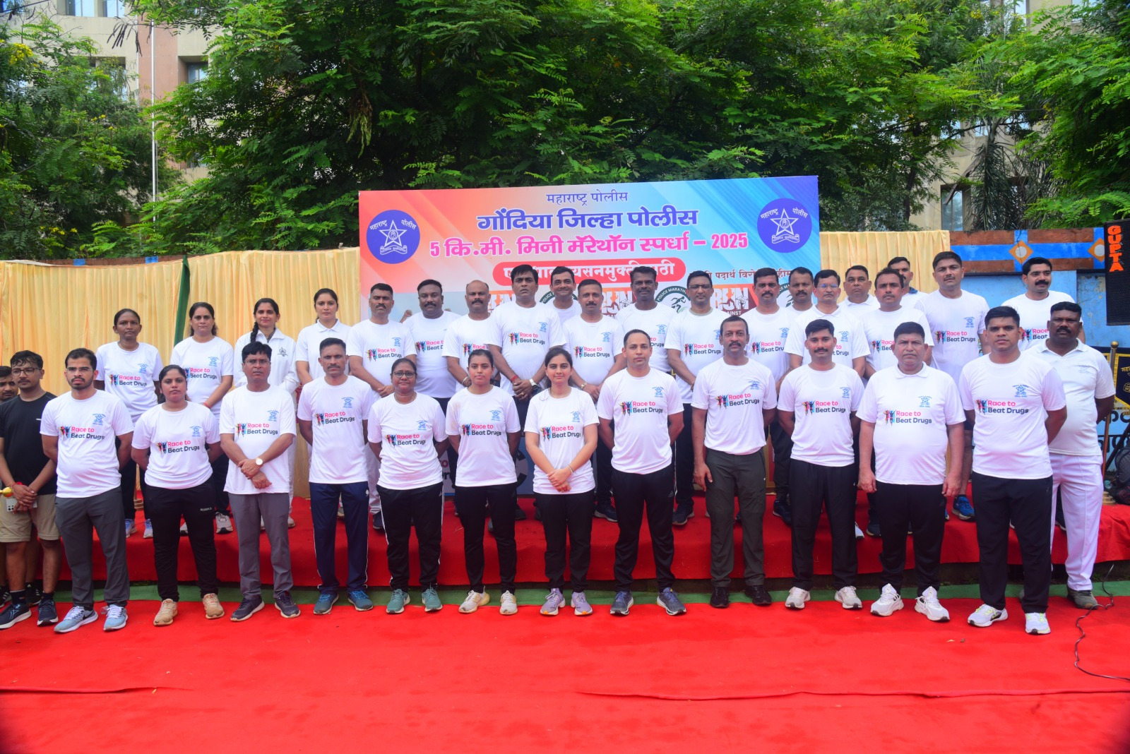 सदर अंमली पदार्थ विरोधी जनजागृती मोहीम मिनी मॅरेथॉन स्पर्धेमध्ये श्री गोरख भामरे, पोलीस अधीक्षक गोंदिया ,श्री तुषार ढमढेरे, उपवनसरंक्षक सामाजिक वनीकरण , श्री अभय डोंगरे, अपर पोलीस अधीक्षक गोंदिया, श्रीमती रोहिणी बानकर , उपविभागीय पोलीस अधिकारी गोंदिया , श्री प्रमोद मडामे, उपविभागीय पोलीस अधिकारी आमगाव, श्री विवेक पाटील , उपविभागीय पोलीस अधिकारी देवरी , श्री साहिल झारकर, उपविभागीय पोलीस अधिकारी तिरोडा, श्री पुरुषोत्तम अहेरकर, पोलीस निरीक्षक स्थानिक गुन्हे शाखा गोंदिया, श्री श्रीकांत कांबळे, तहसीलदार गोंदिया शहर, श्री समशेर पठाण, तहसीलदार गोंदिया ग्रामीण, श्री दिलीप कौशिक, आर. एफ. ओ, गोंदिया , गोंदिया जिल्ह्याचे सर्व पोलीस स्टेशन चे प्रभारी अधिकारी तसेच गोंदिया जिल्हा पोलीस दलातील ४०० ते ५०० पोलीस अधिकारी व अंमलदार व २०० ते ३०० स्थानिक महिला व पुरुषांनी प्रत्यक्ष सहभाग घेतला.