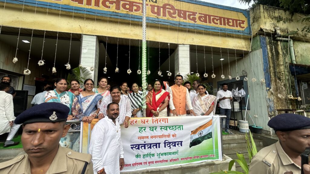 नपा कार्यालय में ध्वजारोहण कर नपाध्यक्ष श्रीमती ठाकुर ने कहा कि भारत देश को आजादी महापुरूषों और असंख्य वीर सपूतों के बलिदान से मिली है इसे संजोकर रखना तथा राष्ट्रप्रेम की भावना को जागृत बनाये रखना सभी का कर्तव्य है। हर घर स्वच्छता उत्सव प्रेरित है राष्ट्र निर्माण एवं स्वच्छता के प्रति जागरूकता को लेकर जिसमें नशामुक्त समाज का निर्माण करना है। नशा छोडऩे का संकल्प लेकर स्वयं इसकी शुरूआत करें। नपाध्यक्ष ने सफाई मित्रों के कार्यो की प्रशंसा करते हुए कहा कि आपके परिश्रम से ही बालाघाट नगरपालिका राष्ट्रीय स्तर पर 76 वें से 44 वें पायदान पर आई है निश्चित ही आपकी मेहनत और लगन से हम प्रथम स्थान प्राप्त करेंगे। नपाध्यक्ष ने नगरवासियों एवं नपा कर्मियों से कहा कि स्वतंत्रता दिवस पर संकल्प लें कि नगर को साफ-सुथरा रखेंगे, प्लास्टिक पॉलिथिन का उपयोग नहीं करेंगे, घर-परिसर को स्वच्छ बनाये रखेंगे।नगरपालिका में ध्वजारोहण के दौरान पूर्व मंत्री गौरीशंकर बिसेन,भाजपा ज़िलाध्यक्ष पूर्व मंत्री रामकिशोर कावरे,पूर्व नपाध्यक्ष रमेश रंगलानी,अनिल धुवारे श्रीमती रेखा बिसेन, ओबीसी कल्याण आयोग अध्यक्ष मौसम बिसेन, नपा उपाध्यक्ष योगेश बिसेन,भूतपूर्व सैनिक संघठन के जिला अध्यक्ष संजू धुवारे ,नपा ब्राण्ड एम्बेसडर एल आर गौतम सभापति संगीता खगेश कावरे, योगिता विनय बोपचे, संगीता छोटू थापा,समीर जायसवाल,कमलेश पांचे, उज्जवल आमाडारे,पार्षदगण वन्दना बारमाटे,सरिता केवल सोनेकर,श्वेता सौरभ जैन,गिरीश कावड़े,राज हरिनखेरे, गजेन्द्र भारद्वाज,जैनेन्द्र कटरे,राजेश लिल्हारे,सीएमओ बीडी कतरोलिया, विभागो के अधिकारी, कर्मचारी, सफाई मित्र, फायरमेन सहित गणमान्य नागरिकों की उपस्थिति रही।