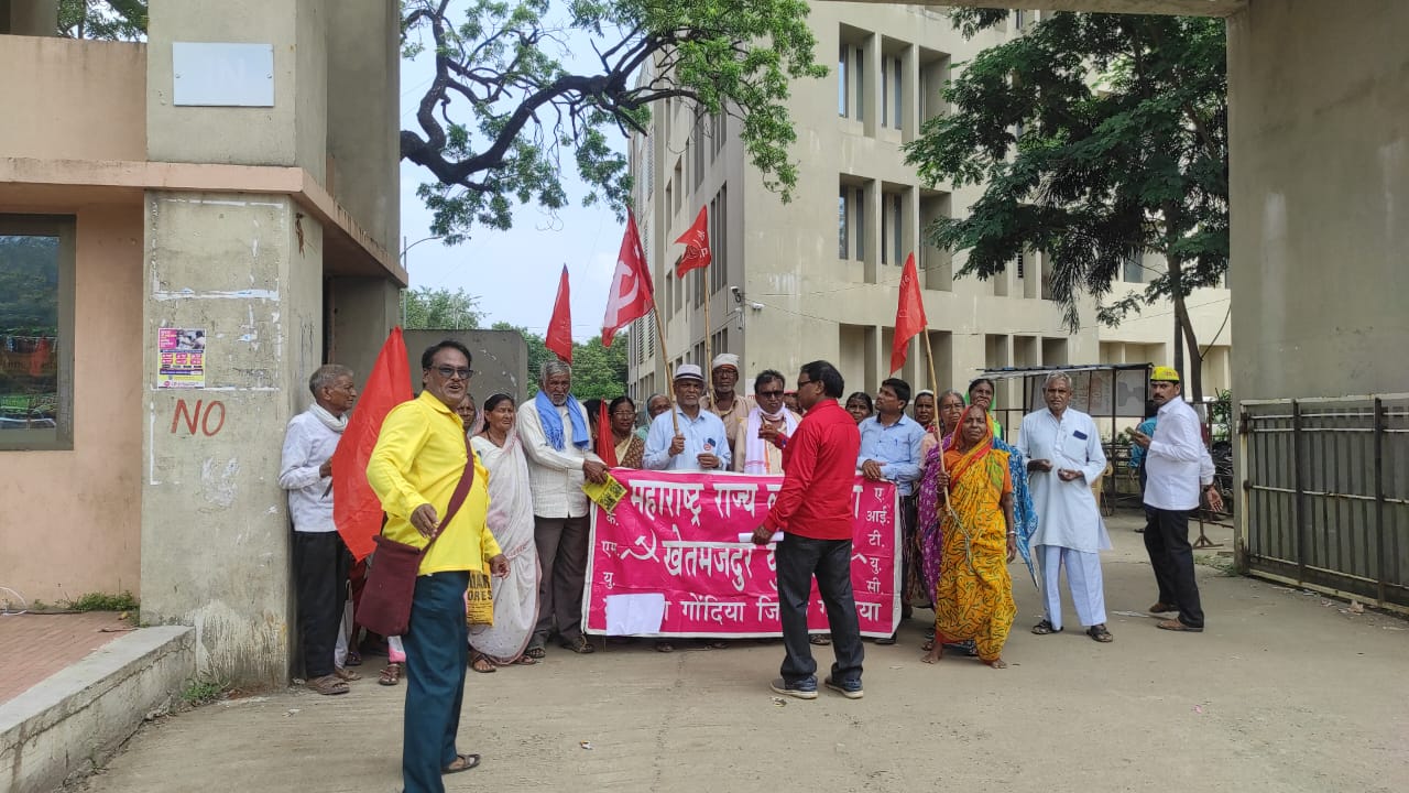 वन हक्क जमीनीचे पट्टे द्या, श्रावण बाळ, वृध्दापकाळ, संजय गांधी निराधार योजना, बीपीएल लाभार्थ्यांना १० तारखेच्या आत थकीत असलेली अर्थसहाय्य देण्यात यावे, मनरेगाची दैनिक मजूरी ६०० रूपये करण्यात यावे, शेतमजूरांना मासिक पेंशन ६ हजार रूपये करण्यात यावे, नवीन रेशन कार्ड मोहीम सुरू करण्यात यावी आदि विविध मागण्यांना घेवून महाराष्ट्र राज्य लाल बावटा शेतमजूर युनियनच्या वतीने १९ सप्टेंबर गोंदिया व गोरेगाव येथे आंदोलन करण्यात आले. गोंदिया येथील प्रशासकीय इमारतीसमोर घोषणाबाजी करून सरकारविरूध्द प्रदर्शन करण्यात आले. आंदोलनाचे नेतृत्व लाल बावटा शेतमजूर युनियनचे जिल्हाध्यक्ष प्रल्हाद उके, भाकपचे जिल्हा सहसचिव परेश दुरुगवार, रामचंद्र पाटील यांनी केले. तहसीलदार शमशेर पठाण यांना मागण्याचे निवेदन सादर करण्यात आले. आंदोलनात जितु गजभिये, सुरेश रंगारी, प्रकाश डहाट, विमला रामटेके, हेमराज खांडेकर, मधुकर नागवंशी व अनेक कर्यकर्ते उपस्थित होते. गोरेगाव येथे गोरेगांव बसस्थानक येथून तहसील कार्यालयपर्यत मोर्चा काढण्यात आला. मोर्च्याचे नेतृत्व राज्य उपाध्यक्ष हौसलाल रहांगडाले, कल्पना डोंगरे, अशोक मेश्राम, गुणवतराव नाईक, दुलीचंद कावडे यांनी केले. वनजमिनीवर अतिक्रमण करणार्यांना मालकी पट्टे देण्यात यावे, जमीन सोडण्याचे नोटीस मागे घेण्यात यावे, शेतमजुरांना पेंशन लागु करण्यात यावी, मनरेगाची मजुरी ६०० रूपये करण्यात यावी, नवीन रेशन कार्ड बनविण्याची मोहीम सुरू करावी, निराधारांना महिन्याच्या १० तारखेला मानधन देण्यात यावे, आदि विविध मागण्यांचे निवेदन तहसीलदार मार्फत राज्य शासनाला देण्यात आले. या आंदोलनात पदाधिकारी, कार्यकर्ते मोठ्या संख्येत सहभागी झाले होते.