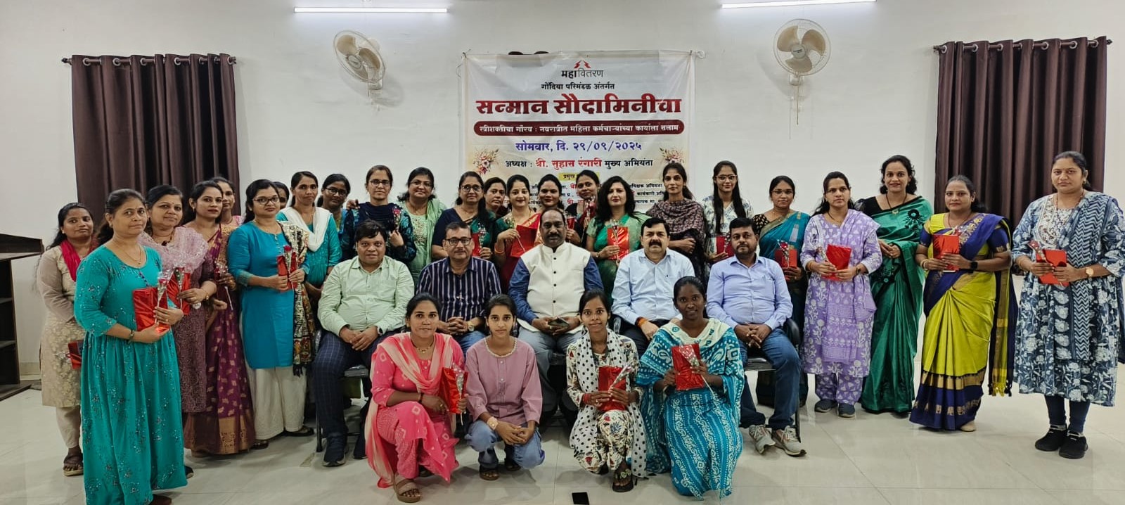 गोंदिया : स्त्री शक्तीला समर्पित नवरात्र उत्सवाला दिनांक २२.०९.२०२५ पासून प्रारंभ झालेला आहे. नवरात्रात ९ दिवसांमध्ये आदिशक्ती स्वरूप दुर्गा देवीच्या नवरूपांची पूजा केली जाते. हा उत्सव महिलांच्या शक्तीचा त्यांच्या विविध कलागुणांचा आणि त्यांच्या क्षमतेच्या गौरव करणारा असतो. महावितरण (mahavitaran) कंपनी ही वीज क्षेत्राशी निगडीत आहे , वीज ही मानवी जीवनाची मूलभूत गरज आहे. प्रामुख्याने सुरळीत व दर्जेदार वीज पुरवठा व उत्कृष्ट ग्राहकसेवेची जबाबदारी महावितरण करून पार पाडण्यात येते. विजसेवेसारख्या कठीण व जोखीमेच्या तांत्रिक क्षेत्रातमध्ये महिला अधिकारी, अभियंता, तांत्रिक कर्मचारी आपल्या पारिवारिक जबाबदारी सांभाळून, सक्षमपणे कार्यालयीन कामकाज पार पाडून नावलौकिक कमवून स्वतःला सिद्ध केले आहे.. महिलांच्या उल्लेखनीय कामगिरी ची दखल घेऊन महिला कर्मचाऱ्याचा गौरव करण्या करिता नवरात्री मध्ये “सन्मान सौदामिनीचा” कार्यक्रम राबविण्याच्या मुख्य कार्यालयाने सूचना दिल्या त्या अनुषंगाने गोंदिया परिमंडळ येथे दिनांक २९.०९.२०२५ ला महावितरण (mahavitaran) गोंदिया मधील महिला अभियंता अधिकारी / कर्मचारी यांचा गौरव करण्यात आला. कार्यक्रमामध्ये गोंदिया परिमंडळ , प्रविभाग व महावितरण (mahavitaran) गोंदिया विभाग रामनगर येथे कार्यरत सर्व महिला उपस्थित होत्या . सर्व महिलांचा कार्यक्रमाचे अध्यक्ष श्री सुहास रंगारी मुख्य अभियंता यांच्या हस्ते गुलाब पुष्प व पुस्तक देऊन गौरव करण्यात आला..महिलांनी आपले मनोगत व्यक्त केले . पारिवारिक व सामाजिक जबाबदारी स्वीकारून त्या आपले कर्तव्य पार पाडतात. मूल बाळ सांभाळून त्या आपल्या कर्तव्या वर १००% कार्यक्षमता देतात. काही महिला अभियंत्यांनी त्यांचे कंपनी मधील जूने अनुभव सांगितले. महिलांच्या समस्या व विषमता यावर भर देऊन जुन्या आठवणींना उजाळा दिला.