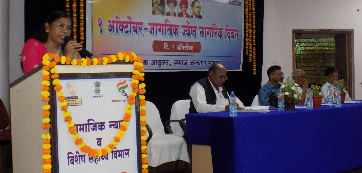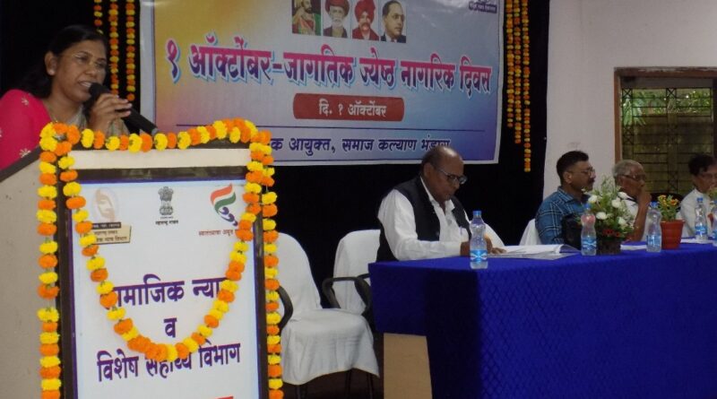 त्यानुषंगाने सामाजिक न्याय व विशेष सहाय्य विभागाअंतर्गत सहाय्यक आयुक्त, समाज कल्याण, डॉ. बाबासाहेब आंबेडकर सामाजिक न्याय भवन, सिव्हील लाईन, जि.प.चौक, भंडारा येथे दि. 1 ऑक्टोंबर, 2025 रोजी दुपारी 1.00 वाजता “जागतिक ज्येष्ठ नागरिक दिवस” (International Day of Older Person) दिन कार्यक्रमाचे आयोजन करण्यात आले आहे. सदर “जागतिक ज्येष्ठ नागरिक दिवस” औचित्य साधून सहाय्यक आयुक्त, समाज कल्याण, भंडारा तसेच आरोग्य विभागाचे जिल्हा शल्य चिकीत्सक, सामान्य रुग्णालय, भंडारा यांचे संयुक्त विद्यमाने ज्येष्ठ नागरिकांच्या आरोग्य तपासणीकरीता शिबीराचे आयोजन करण्यात आले. सदर कार्यक्रमाचे अध्यक्षस्थान डॉ.रविंद्र वानखेडे सर यांनी भुषविले व उद्घाटक म्हणू नश्रीमती आशा कवाडे, सहाय्यक आयुक्त, समाज कल्याण, भंडारा तसेच सदर कार्यक्रमास प्रमुख पाहुने म्हणून श्री.हिरामण लांजेवार अध्यक्ष जिल्हा जेष्ठ नागरीक मंडळ, (फेस्कॉम) भंडारा, सचिव, भंडारा जिल्हा जेष्ठ नागरीक मंडळ (फेस्कॉम) भंडारा तसेच श्री.शाम कुकडे, योग शिक्षक हे उपस्थित होते.