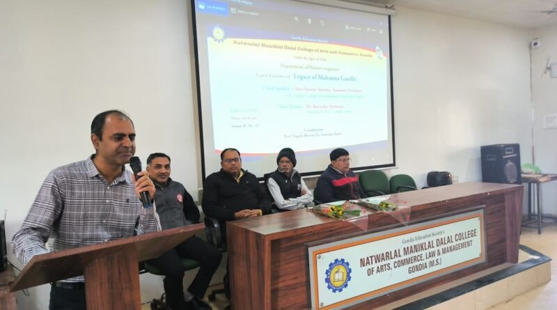 गोंदिया शिक्षण संस्थेचे मार्गदर्शक प्रफुल पटेल, अध्यक्षा वर्षा पटेल, सचिव राजेंद्र जैन, संचालक निखिल जैन यांच्या मार्गदर्शनात प्राचार्य डॉ. रवींद्र मोहतुरे यांच्या नेतृत्वात गोंदिया शिक्षण संस्था द्वारा संचालित येथील नटवरलाल माणिकलाल दलाल महाविद्यालयात ‘महात्मा गांधी यांचा वारसा’ या विषयावर मार्गदर्शन व्याख्यानाचे आयोजन करण्यात आले होते. या कार्यक्रमात प्रा. नवीन कुमार शर्मा बोलत होते. कार्यक्रमाला मानव्य विद्या शाखा प्रमुख डॉ. एच पी पारधी, डॉ. बबन मेश्राम, प्रा. योगेश भोयर, डॉ. अंबादास बाकरे उपस्थित होते. प्रा. शर्मा पुढे म्हणाले, महात्मा गांधी यांनी १९०९ साली लिहिलेल्या हिंद स्वराज आणि माझे सत्याचे प्रयोग या पुस्तकात आपल्या विचारांची मांडणी केली आहे. पुढे इतरही ठिकाणी मांडलेले विचार देशाचा मूलभूत सर्वागीण विकास साधण्यास प्रेरक आहेत. नामदार गोखले यांच्या सूचनेनुसार गांधीजींनी संपूर्ण भारतभ्रमण केले. त्यामुळे गांधीजींनी भारताची नाडी अचूक ओळखली होती. म्हणून भारताच्या विकासासाठी गांधीवाद हाच शाश्वत विकासाचा मार्ग आहे. महात्मा गांधींच्या विचारांना टाळून साधलेला विकास विनाशाकडे घेऊन जाईल, असे सांगितले. विद्यार्थ्यांनी प्लास्टिकचा वापर टाळावा, नेहमी सत्य बोलावे, असे केल्याने त्यांच्यात आत्मबल वाढेल असे प्रा. शर्मा यांनी ठामपणे सांगितले.