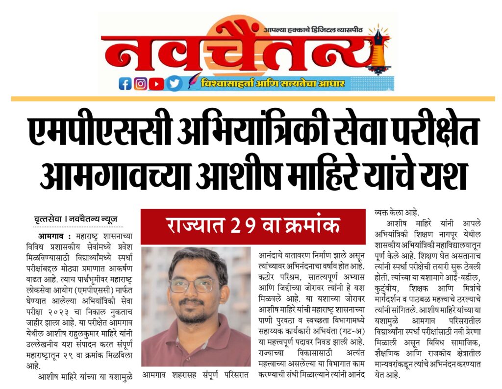 आमगाव : महाराष्ट्र शासनाच्या विविध प्रशासकीय सेवांमध्ये प्रवेश मिळविण्यासाठी विद्यार्थ्यांमध्ये स्पर्धा परीक्षांबद्दल मोठ्या प्रमाणात आकर्षण वाढत आहे. त्याच पार्श्वभूमीवर महाराष्ट्र लोकसेवा आयोग (एमपीएससी) मार्फत घेण्यात आलेल्या अभियांत्रिकी सेवा परीक्षा २०२३ चा निकाल नुकताच जाहीर झाला आहे. या परीक्षेत आमगाव येथील आशीष राहुलकुमार माहिरे यांनी उल्लेखनीय यश संपादन करत संपूर्ण महाराष्ट्रातून २९ वा क्रमांक मिळविला आहे.