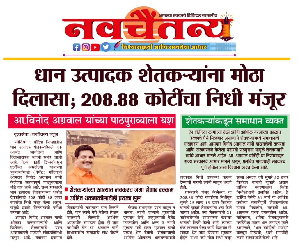 गोंदिया जिल्ह्यातील धान उत्पादक शेतकर्यांसाठी एक अत्यंत आनंदाची आणि दिलासादायक बातमी समोर आली आहे. गेल्या काही दिवसांपासून प्रलंबित असलेल्या धानाच्या चुकार्यांसाठी (पेमेंट) गोंदियाचे आमदार विनोद अग्रवाल यांनी केलेल्या सातत्यपूर्ण पाठपुराव्याला मोठे यश आले आहे. राज्य सरकारने धान उत्पादक शेतकर्यांच्या थकीत देयकांसाठी २०८ कोटी ८८ लाख रुपयांचा निधी मंजूर केला असून, यामुळे हजारो शेतकर्यांची प्रतीक्षा संपणार आहे.