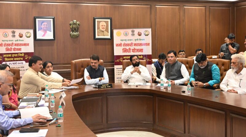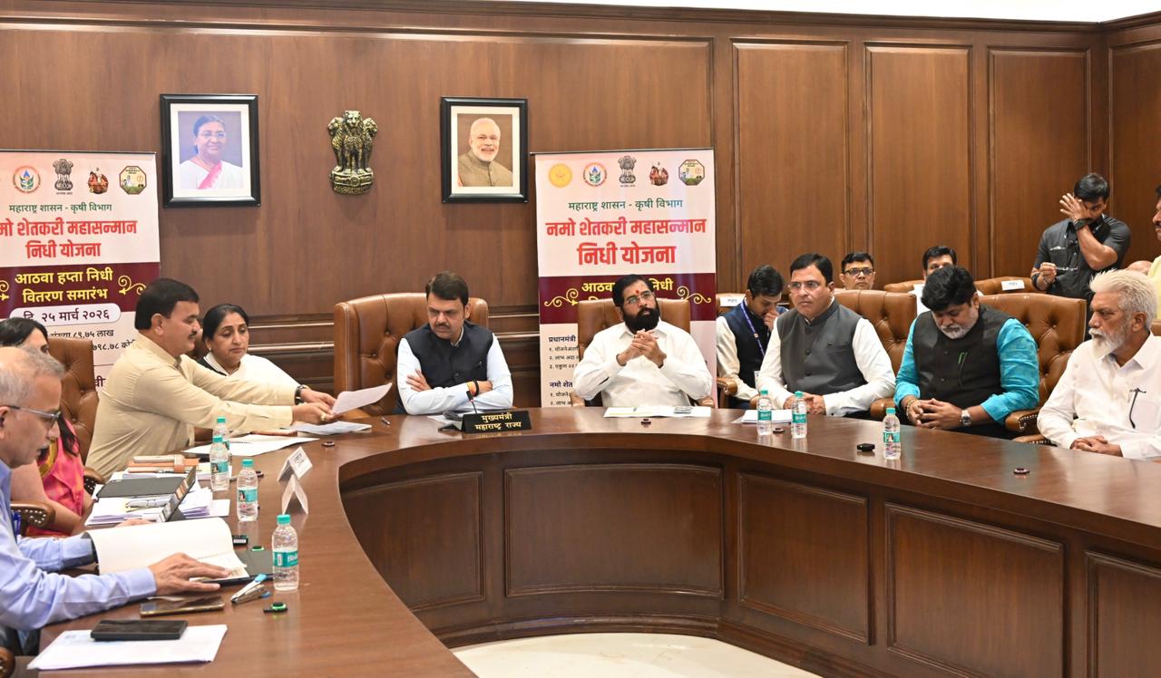 यावेळी व्यासपीठावर उपमुख्यमंत्री एकनाथ शिंदे, उपमुख्यमंत्री सुनेत्रा अजित पवार, कृषी मंत्री दत्तात्रय भरणे, उद्योग व मराठी भाषा मंत्री डॉ. उदय सामंत, शालेय शिक्षण मंत्री दादाजी भुसे, राज्यमंत्री ॲड. आशिष जयस्वाल यांच्यासह कृषी विभागाचे अपर मुख्य सचिव विकासचंद्र रस्तोगी आणि शासनाचे वरिष्ठ अधिकारी उपस्थित होते.या योजनेअंतर्गत राज्यातील सर्व जिल्ह्यांमध्ये निधीचे वाटप करण्यात आले असून, यामध्ये सर्वाधिक निधी अहिल्यानगर जिल्ह्याला १०८.३० कोटी रुपये इतका मिळाला आहे. त्याखालोखाल सोलापूर ९७.५२ कोटी, कोल्हापूर ९२.३३ कोटी, सातारा ८७.०७ कोटी आणि पुणे जिल्ह्याला ८५.२४ कोटी रुपयांचे वितरण करण्यात आले आहे. इतर जिल्ह्यांमध्ये नाशिक ८३.८६ कोटी, जळगाव ७७.४० कोटी, नांदेड ७६.५० कोटी, बीड ७२.७० कोटी आणि छत्रपती संभाजीनगर जिल्ह्याला ६८.१८ कोटी रुपये मिळाले आहेत.विदर्भातील जिल्ह्यांमध्ये यवतमाळ ५७.१८ कोटी, अमरावती ५३.३४ कोटी, चंद्रपूर ४७.९५ कोटी, गोंदिया ४२.४५ कोटी, भंडारा ४१.६५ कोटी, अकोला ३६.७६ कोटी, नागपूर ३३.८८ कोटी, वाशिम ३३.०५ कोटी, गडचिरोली २८.५० कोटी आणि वर्धा जिल्ह्याला २५.६० कोटी रुपये वितरित झाले आहेत. कोकण विभागाचा विचार करता रत्नागिरी ३१.२१ कोटी, सिंधुदुर्ग २३.५३ कोटी, रायगड २२.७९ कोटी, तर ठाणे जिल्ह्याला १४.१८ कोटी रुपयांचा लाभ मिळाला आहे.मराठवाड्यातील लातूर ५३.८७ कोटी, परभणी ४९.७९ कोटी, धाराशिव ४६.८५ कोटी, जालना ५८.८२ कोटी आणि हिंगोली जिल्ह्याला ३५ कोटी रुपये देण्यात आले आहेत. उत्तर महाराष्ट्रात धुळे ३०.६३ कोटी आणि नंदुरबार जिल्ह्याला २०.४७ कोटी रुपयांचा निधी मिळाला आहे.‘नमो शेतकरी महासन्मान निधी’ योजनेच्या माध्यमातून २४ मार्च २०२६ अखेरपर्यंत, पहिल्या ७ हप्त्यांमध्ये एकूण १३,०१७.३० कोटी रुपये ९३.०८ लाख शेतकरी कुटुंबांच्या खात्यावर जमा करण्यात आले आहेत. आजचा आठवा हप्ता जमा झाल्यामुळे ऐन खरीप हंगामाच्या पूर्वतयारीसाठी शेतकऱ्यांना मोठा आर्थिक आधार मिळाला आहे. थेट लाभ हस्तांतरणामुळे कोणतीही गळती न होता मदतीचा पूर्ण पैसा थेट शेतकऱ्यांपर्यंत पोहोचत असल्याचा विश्वास यावेळी सरकारने व्यक्त केला.