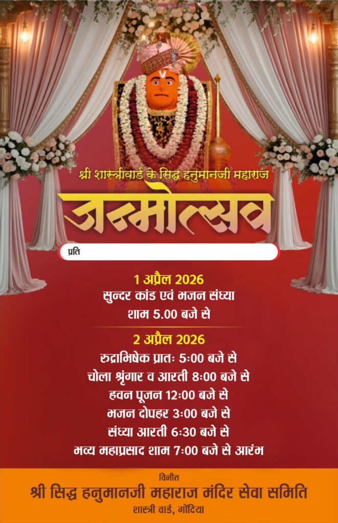 गोंदिया : शहरातील शास्त्री वॉर्ड परिसरातील भाविकांचे श्रद्धास्थान असलेल्या श्री सिद्ध हनुमानजी महाराज यांच्या जन्मोत्सवाचा भव्य सोहळा यंदा मोठ्या उत्साहात साजरा केला जाणार आहे. या निमित्ताने मंदिर सेवा समितीच्या वतीने १ व २ एप्रिल रोजी विविध धार्मिक व सांस्कृतिक कार्यक्रमांचे आयोजन करण्यात आले आहे.